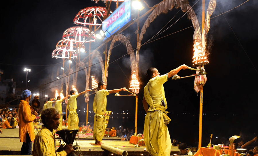 Experience the mesmerizing Ganga Aarti at Dashashwamedh Ghat with Kashi Taxi Service Company, your trusted partner for the best taxi service in Varanasi.